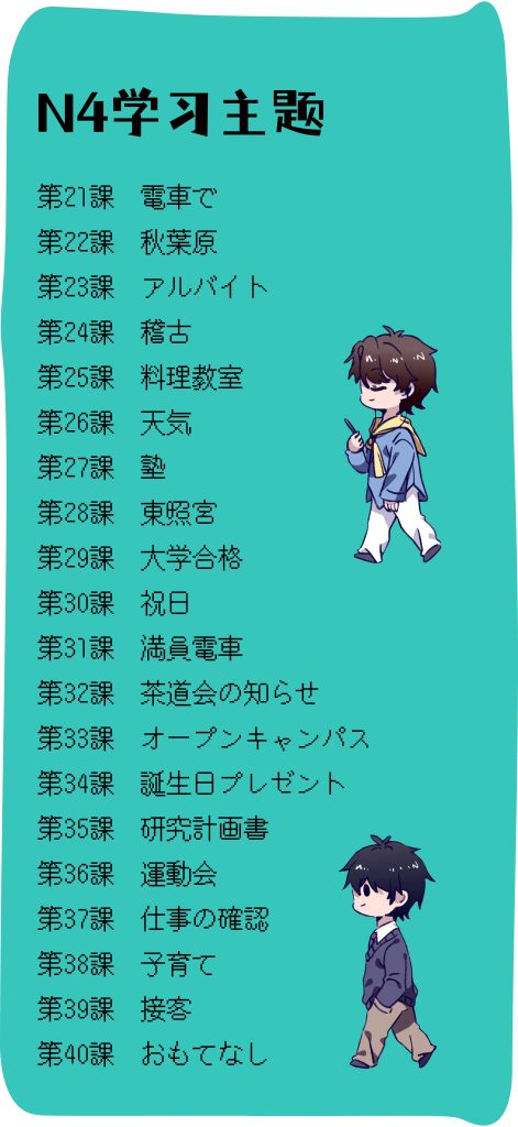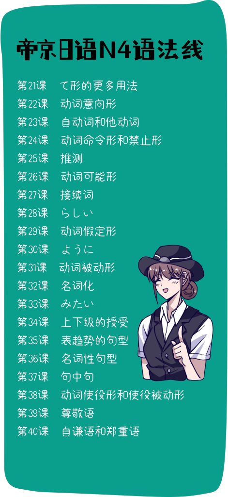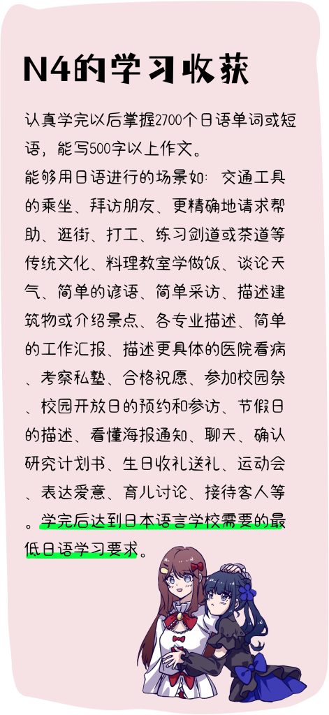 目标:以N5学到的知识为基础,继续深入学习简体的用法以及各种从句句型。学完动词的所有变形,日语的复杂从句、所有的助词基本用法、自动词他动词的区别、深化学习接续词、简单的敬语入门,所有日语的基础句型都是在这个阶段学的。