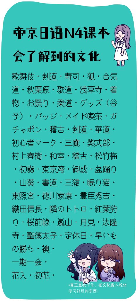 会了解到的日本文化:歌舞伎、剑道、寿司、狐狸、合气道、秋叶原、歌道、浅草寺、祭典、柔道、谷子、紫式部、村上春树、和室、东京湾、御成、山葵、德川家康、月见、法隆寺、一期一会、初花等。