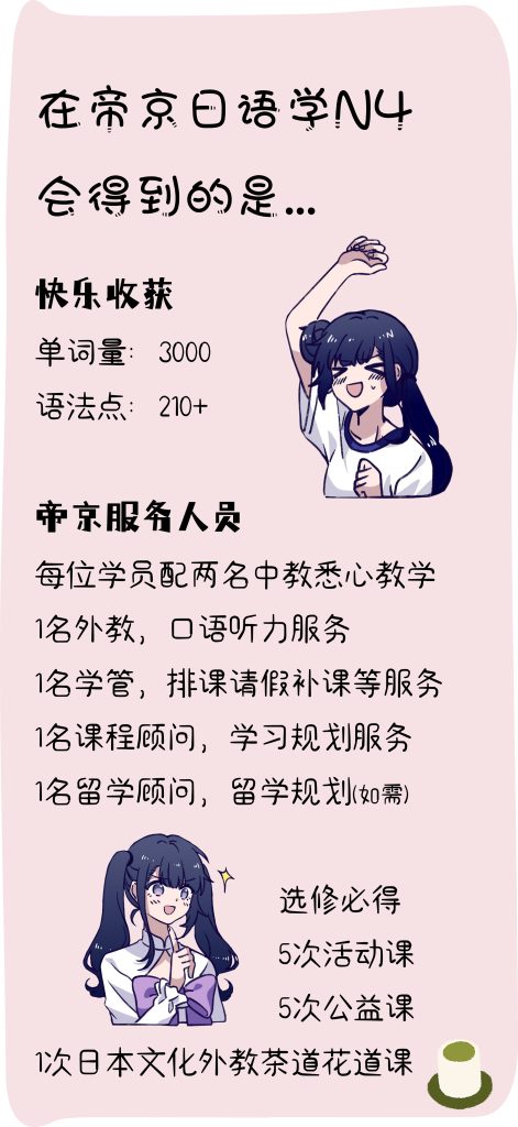 收获:学完以后掌握2700个日语单词或短语,能写500字以上作文。能够用日语进行简单的扔垃圾处理、更精确地请求帮助、逛街、拜访朋友、各专业描述、十二星座、家人朋友工作情况、相亲、理发、马拉松比赛、表达爱意、请事假病假、更具体的医院看病、作为主持人采访节目、写信等。学完后达到日本语言学校需要的最低日语学习要求。*把该背的单词背了才行哟!